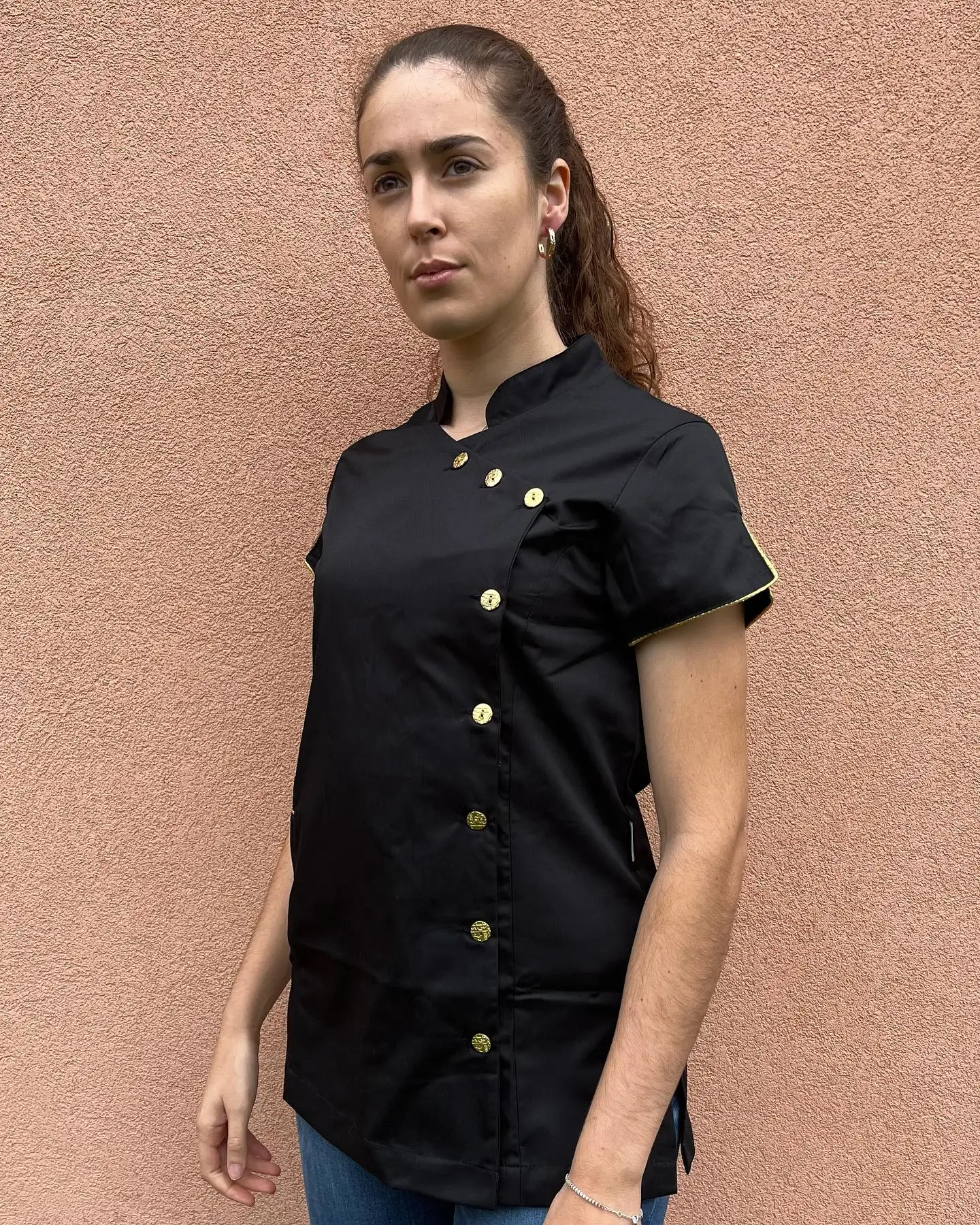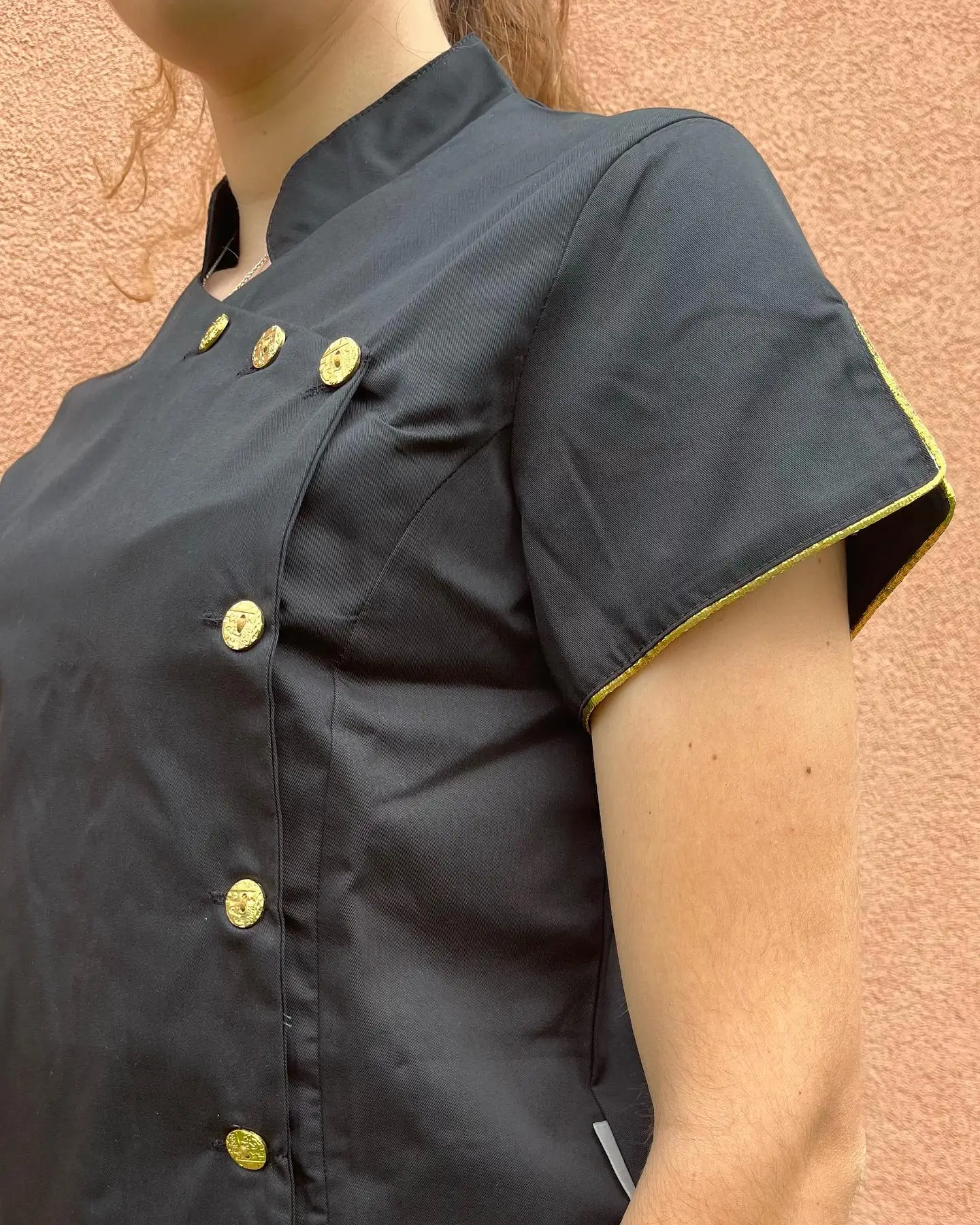Design elegante com base disponível em preto ou branco, ideal para profissionais de estética e saúde. Possui um bolso lateral funcional, perfeito para armazenamento prático. Confeccionado em tecido leve e respirável, garantindo conforto durante o uso. Mangas curtas que proporcionam liberdade de movimento. Botões dourados exteriores adicionam um toque sofisticado, enquanto os pormenores nas mangas e no bolso em dourado realçam a elegância e estilo.