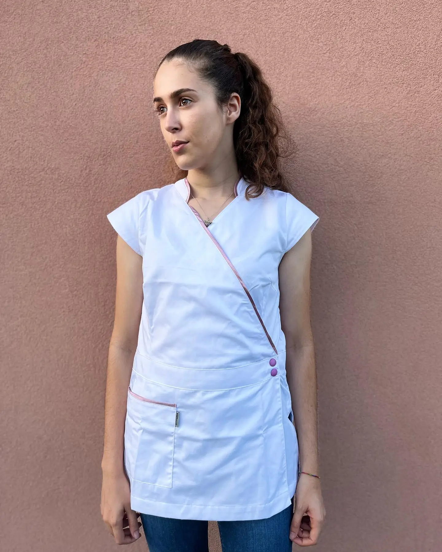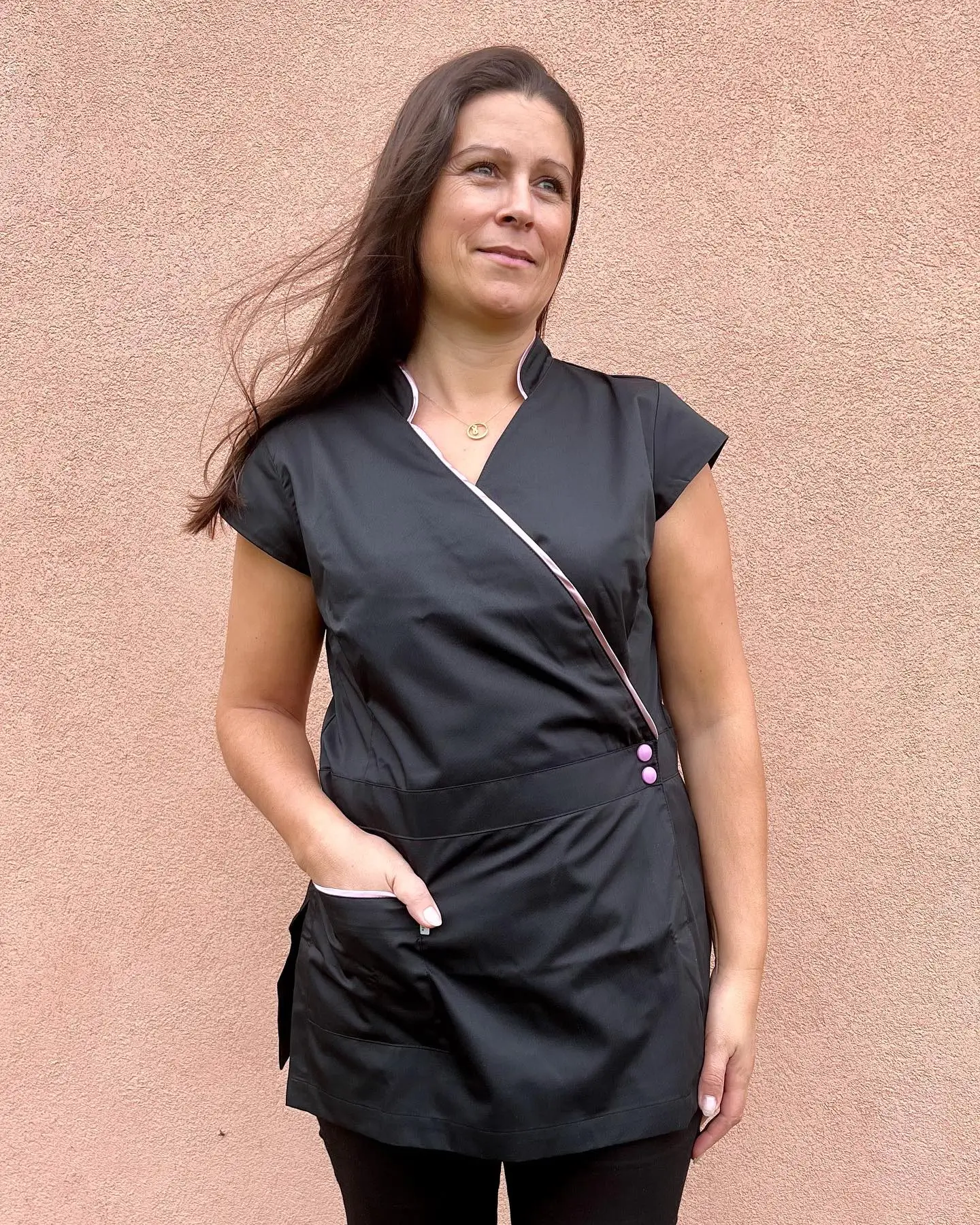 Elegância e funcionalidade definem este modelo, com base disponível em preto ou branco. Inclui bolso lateral prático para armazenamento de pequenos itens essenciais. Confeccionado em tecido leve, garantindo conforto durante todo o dia. Mangas curtas oferecem liberdade de movimento. O design ajustável no interior, complementado por molas exteriores que adicionam sofisticação. Os pormenores em Rose Gold nas molas e acabamentos conferem um toque moderno e feminino.