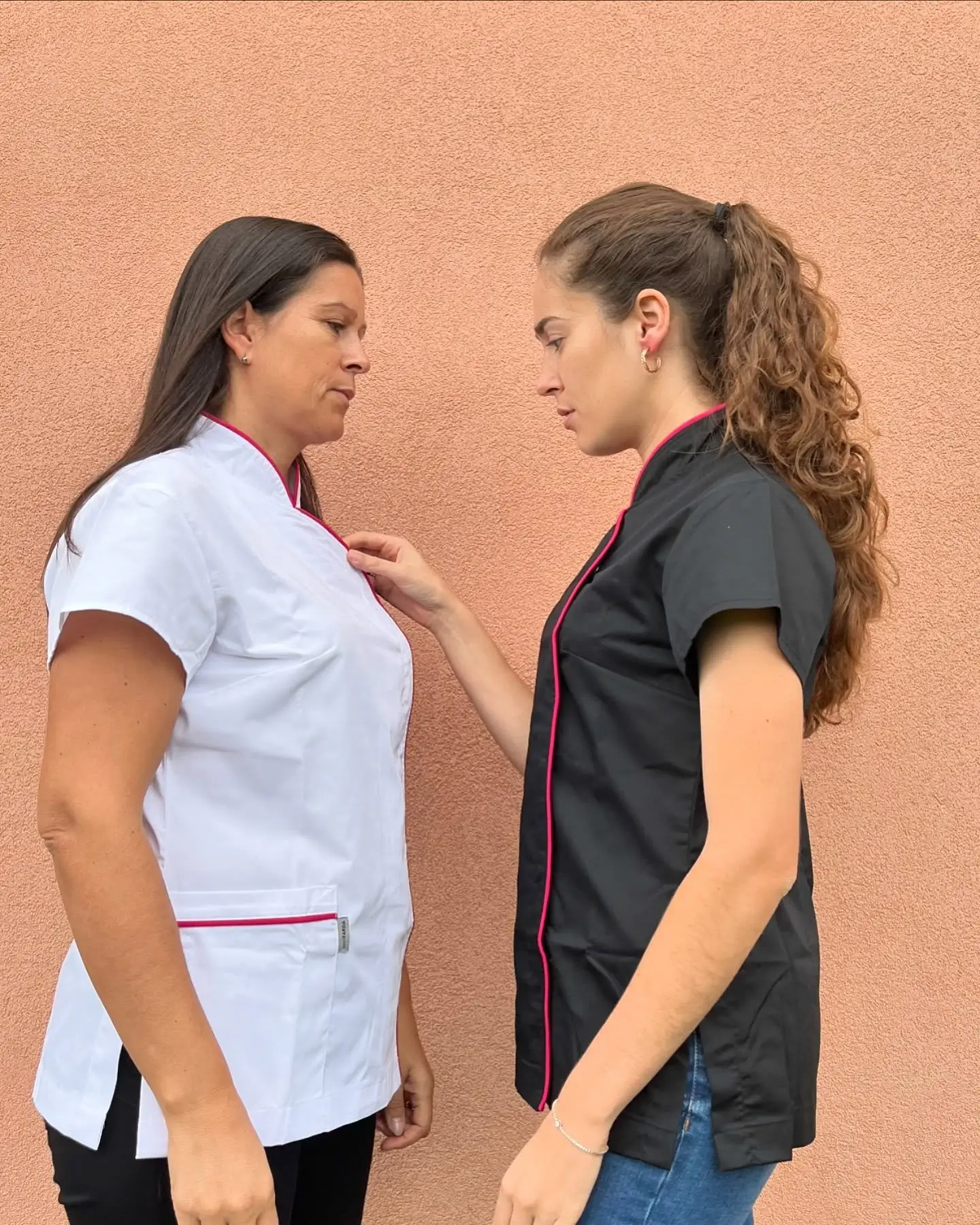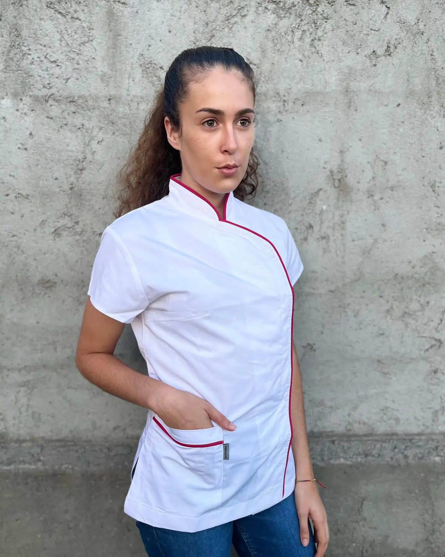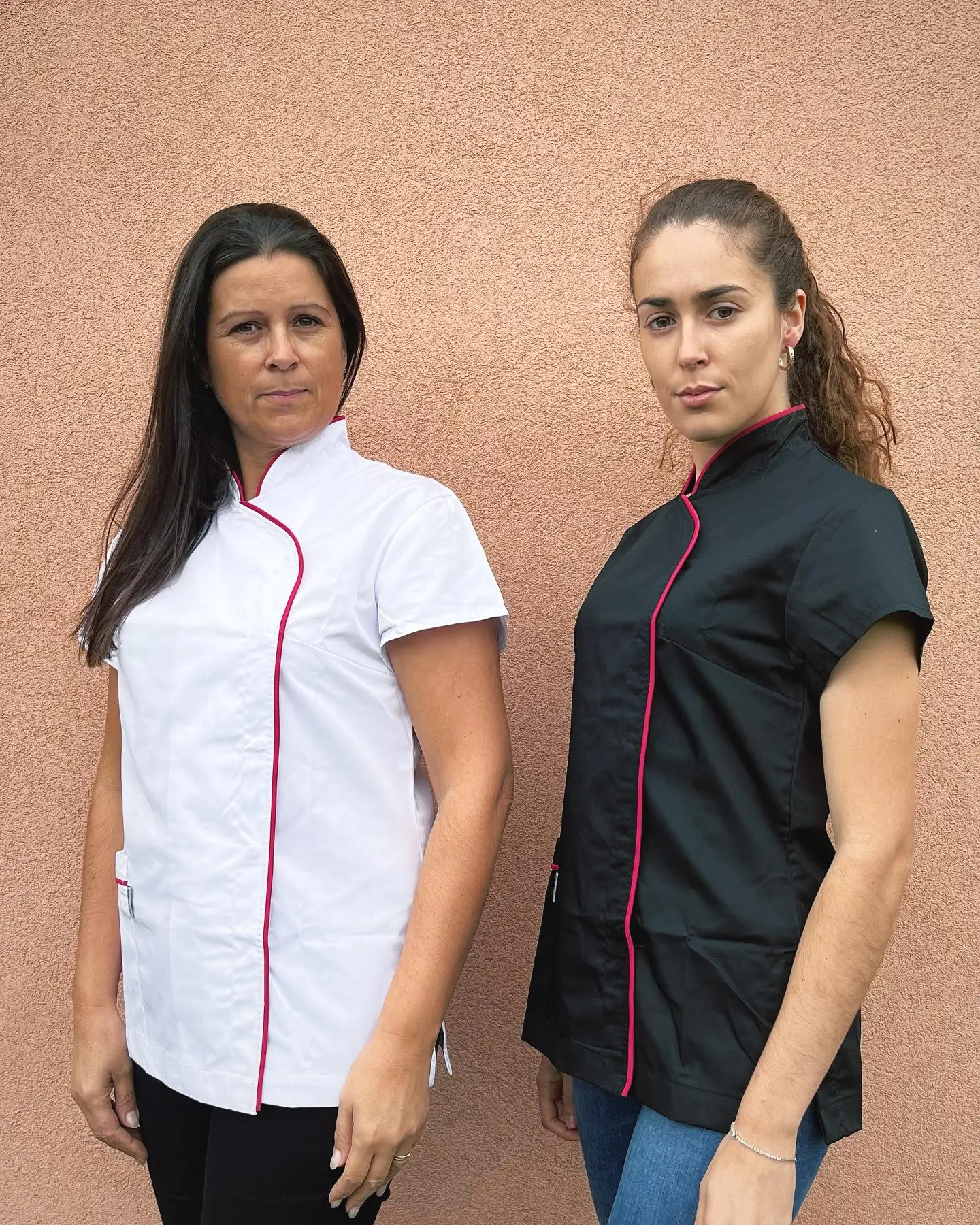 Base disponível em preto ou branco, com um design elegante e minimalista. Apresenta um bolso lateral funcional e prático para armazenamento de pequenos acessórios. Fabricado em tecido leve, ideal para proporcionar conforto durante o trabalho. Com mangas curtas que facilitam a movimentação e molas interiores para ajuste perfeito ao corpo. Detalhes delicados em rosa adicionam um toque moderno e feminino.